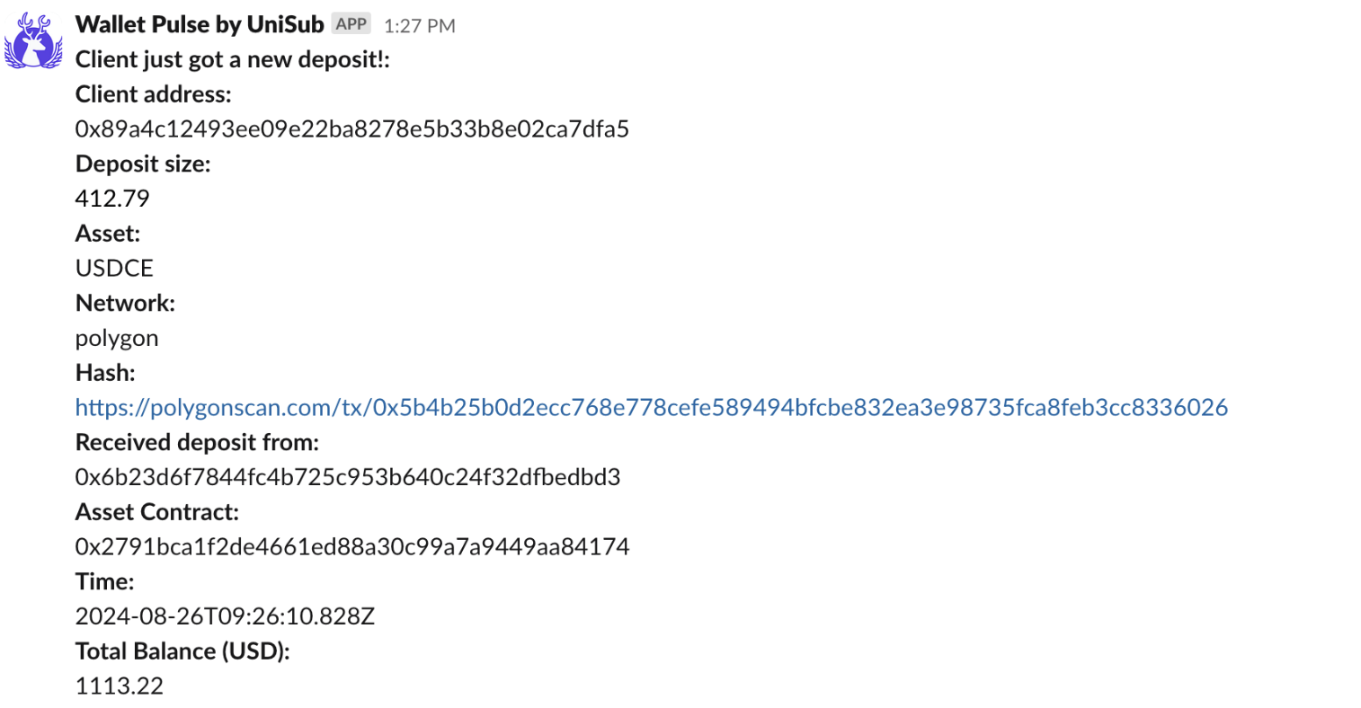 WalletPulse monitors your customer's personal crypto wallet balances and new top-ups, providing real-time notifications and insights into their finances